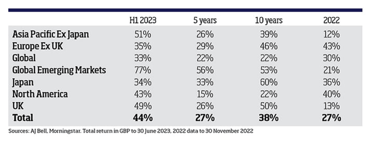 The report also found a marked improvement in the performance of UK equity funds relative to passives. Almost half of UK equity funds beat the passive machines in the first half of the year, considerably higher than the 13% who outperformed in 2022.