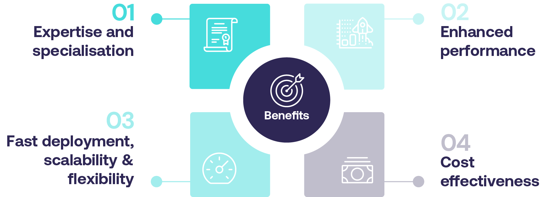 - Reduced operational costs: no need to recruit, hire or train in-house staff.